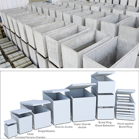 Muslim Chambers Single ChamberGrande Double Burial ChamberSuper Grande Double Burial Chamber Triple Interment Burial System Child Chamber Baby Chamber Shallow Grave Information720mm Grave Extension Ring100mm Grave Extension RingChamber Rain CoverGrassmat Lawn Covers Optional Upgrades Lifting Aids for Lids and Slats Casket Provision