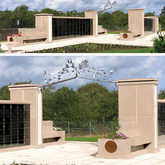 The two structures are joined by a decorative stainless steel Portico of Peace™ arch incorporating doves, leaves and butterflies.