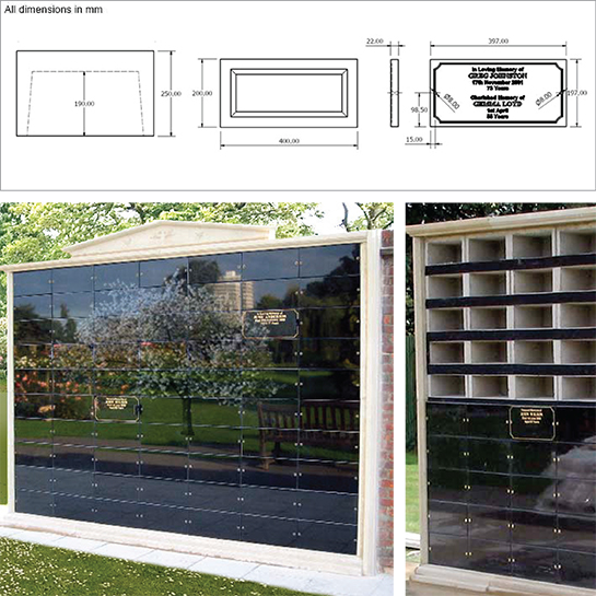 The single niche block is a modular product and can be assembled in a variety of formations to created attractive niche wall installations for cremated remains interment. Please see the following page for example images of such installations.