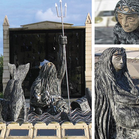 The feature comprises of 'Father Neptune' holding a smiling baby Merchild in his arm as he raises his mighty Trident to the heavens. Looking on are his two happy mermaid daughters. Also in the water are their fish and dolphin friends and a bobbing treasure chest!