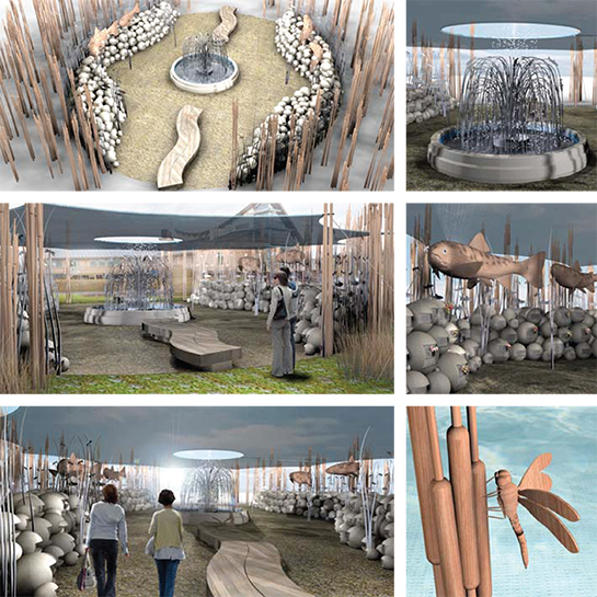 The concept is to produce an ethereal environment to ‘transport’ people to another world. The winding path through creates a feeling of the movement of the current, the snaking bench compliments it like an eel or river bed reeds, the unusually large trout and salmon give the illusion of scale underwater.