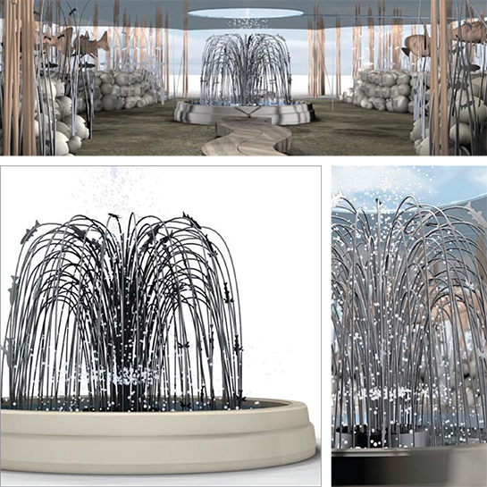 Solar powered water feature in steel with fish and dragonfly details on circular stone base.