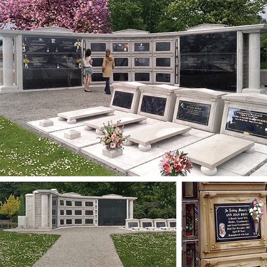The scheme includes niches for cremated remains, double interment below ground burial chambers with classic memorial housings, side and front charging mausoleum.