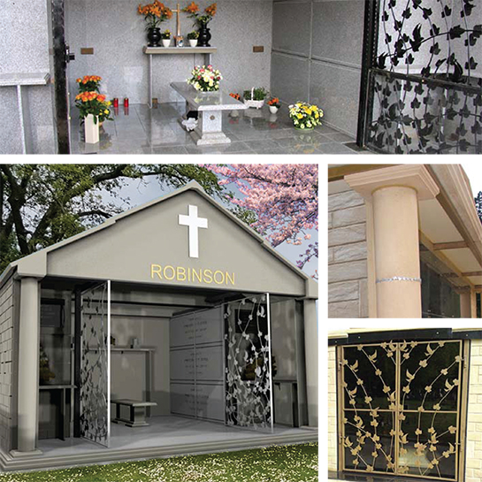 The Stone Chapel Tiber mausoleum is constructed in decorative cast stone with stone columns and stone exterior detailing complimenting a granite clad interior finish.