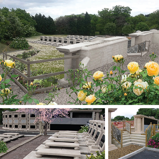 This inspiring new Cemetery Village®, fully designed and built by welters®, includes the impressive 49 interment Embankment Coliseum Mausoleum comprising of an amalgamation of welters® own UK manufactured front charging and side charging mausolea units with integrated niches for cremated remains interments.
