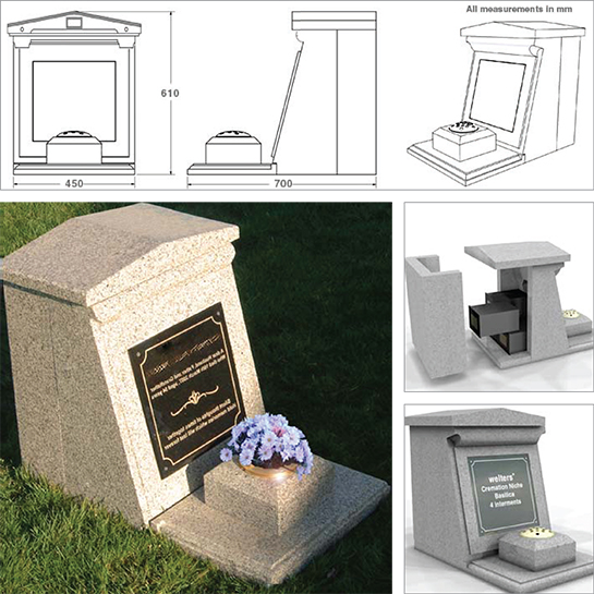 The decorative unit houses a granite memorial plaque which can be inscribed and ready to fix at the time of interment. The housings are for single row configuration and can accept up to four welters cremated remains caskets.