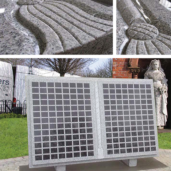 The book is made from gray granite and recessed for the fixing of the black granite plaque inserts.